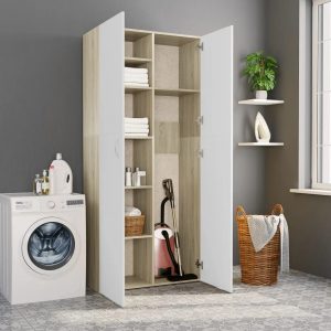El armario ofrece mucho espacio de almacenamiento, gracias a sus 8 generosos compartimentos. Uno es lo bastante grande para permitir guardar una aspiradora. El duradero aglomerado de que está hecho y la calidad de su fabricación hacen al armario robusto, duradero y fácil de limpiar. Tiene un diseño compacto y que saca el máximo partido a los espacios reducidos.
