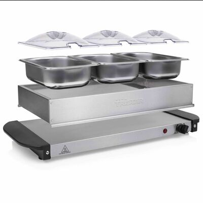 Este práctico calientaplatos 2 en 1 para servir buffets, de la marca Tristar, es ideal para fiestas. ¡Puedes usarlo para calentar la comida del buffet, o también para calentar el plato y que tu comida no se quede fría!