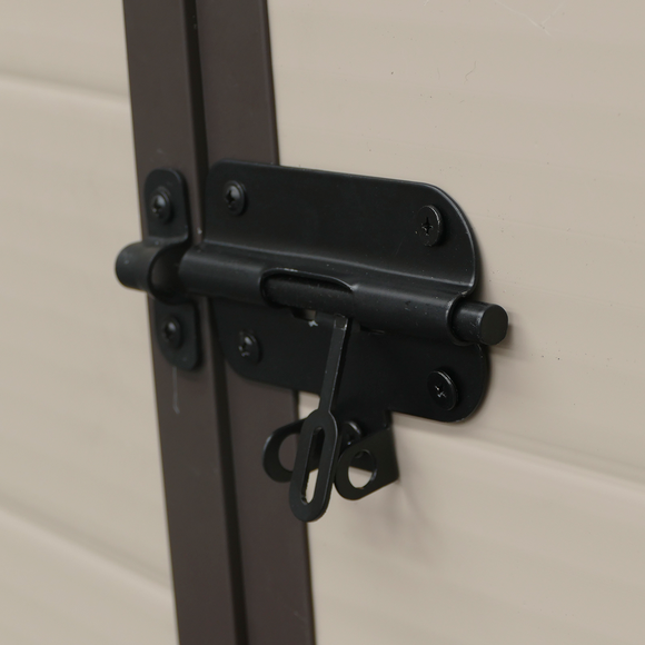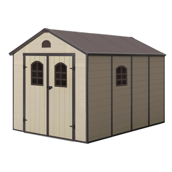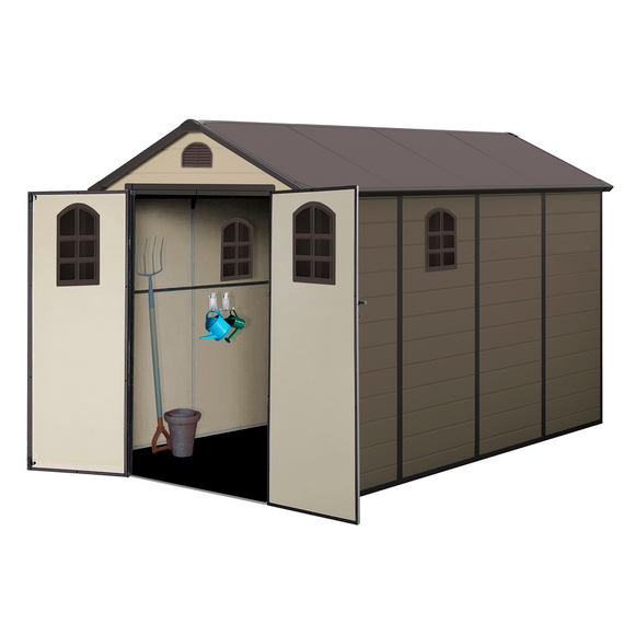 La Caseta de Resina viene con suelo y cuenta con tejado a dos aguas.
