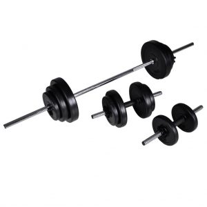 El juego de pesas y mancuernas cuenta con barras de acero cromado con collarines de resorte de acción rápida (para la barra de pesas), agarres granulados antideslizantes y tapas de rosca de estrella estriadas (para las barras de mancuernas) para un acoplamiento seguro de los discos de peso. Los discos de peso están hechos de una robusta carcasa de polietileno. Se pueden combinar de diferentes formas según los fines de entrenamiento.