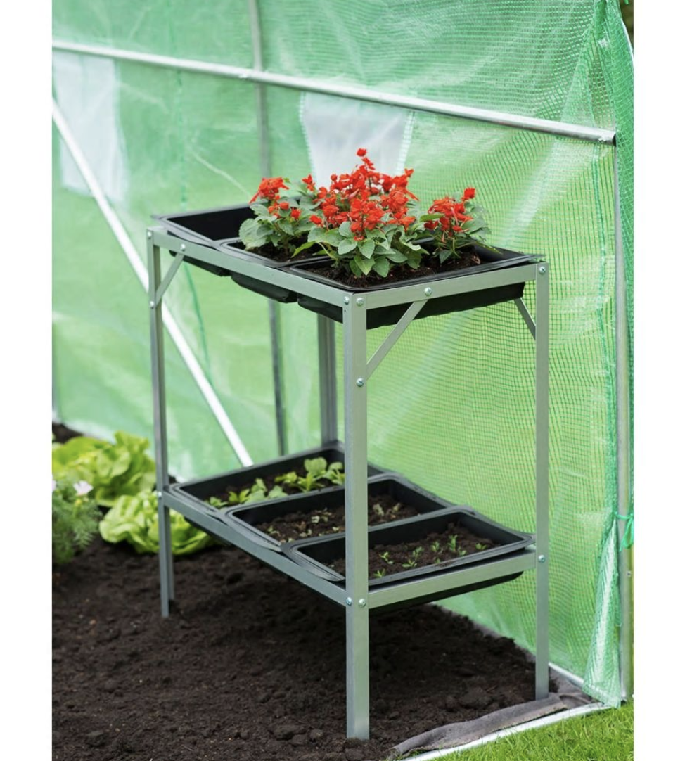 La mesa para macetas está hecha de acero galvanizado y tiene 2 niveles y 6 bandejas de tamaño práctico. Ideal para la preparación de plantones y esquejes, trasplante o mantenimiento de plantas.