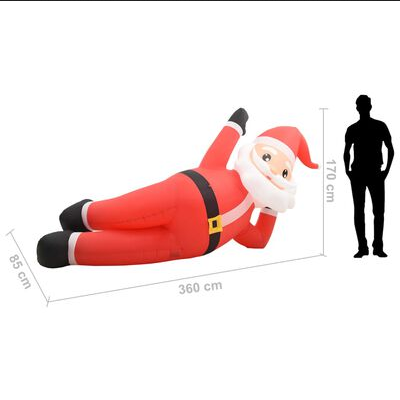 Este gigante Santa Claus tumbado es sin duda una impresionante aporte a tus decoraciones de Navidad. Hecho de tela, este Papá Noel inflable es ligero, resistente a la intemperie, impermeable y además duradero. El Santa Claus se infla automáticamente en segundos. Hay 1 soplador integrado con el Papá Noel inflable para mantener el aire en el producto. Este adorno también es fácil de guardar para la próxima temporada navideña después de haber sido desinflado. Equipado con 5 LED para emitir una luz brillante, este adorno navideño es muy eficiente energéticamente. Se incluyen estacas de tierra y cuerdas en la entrega para fijar al Papá Noel.