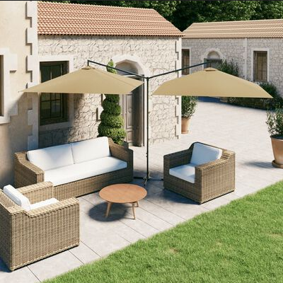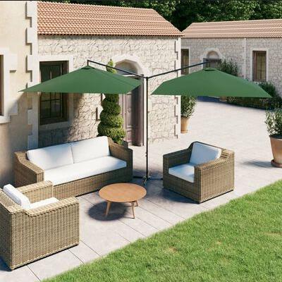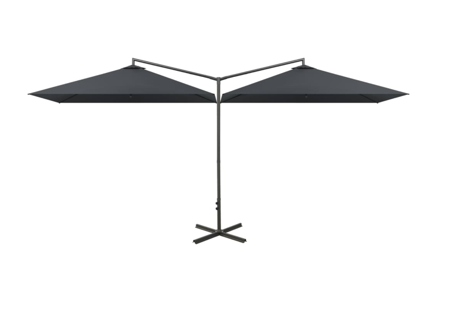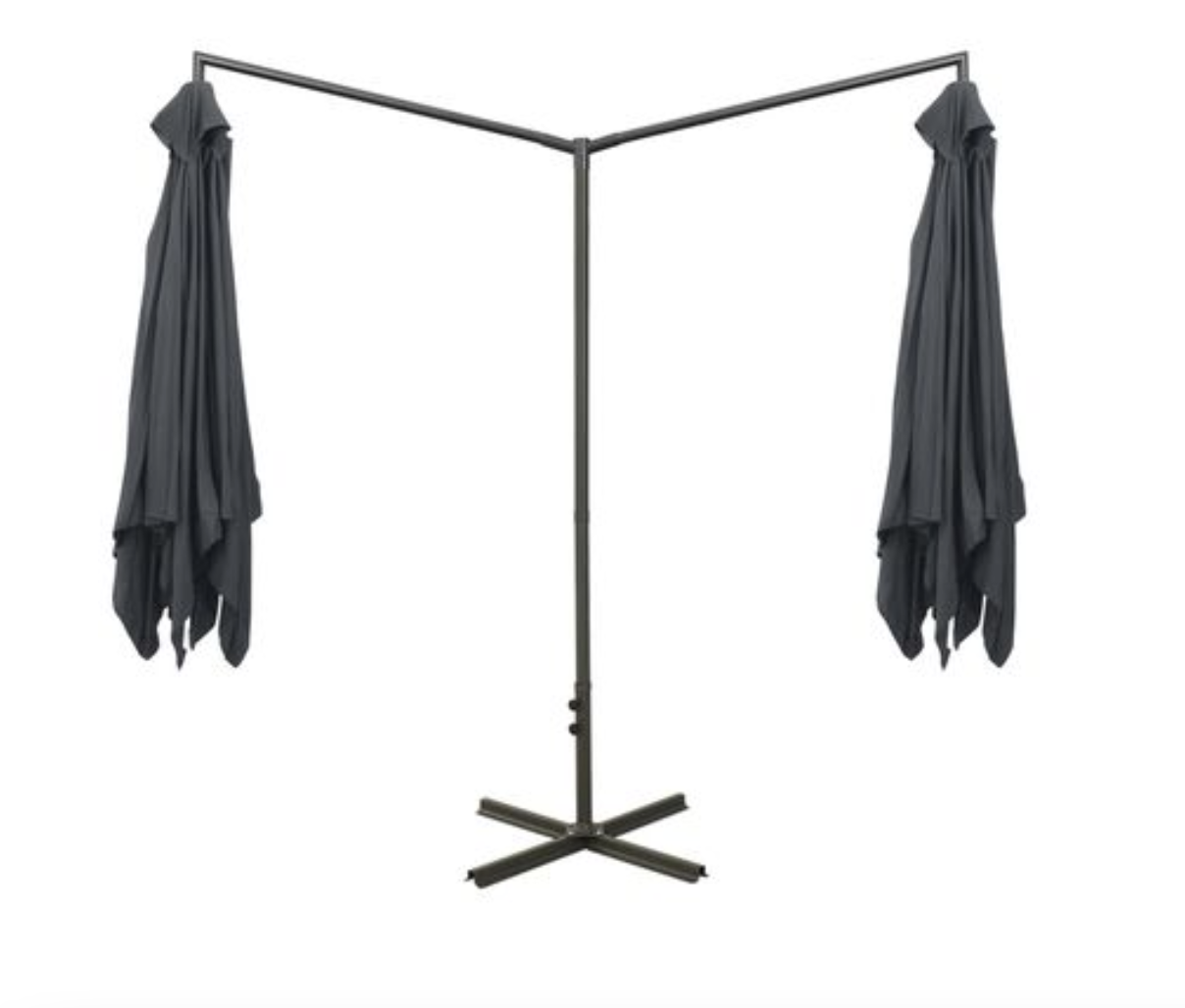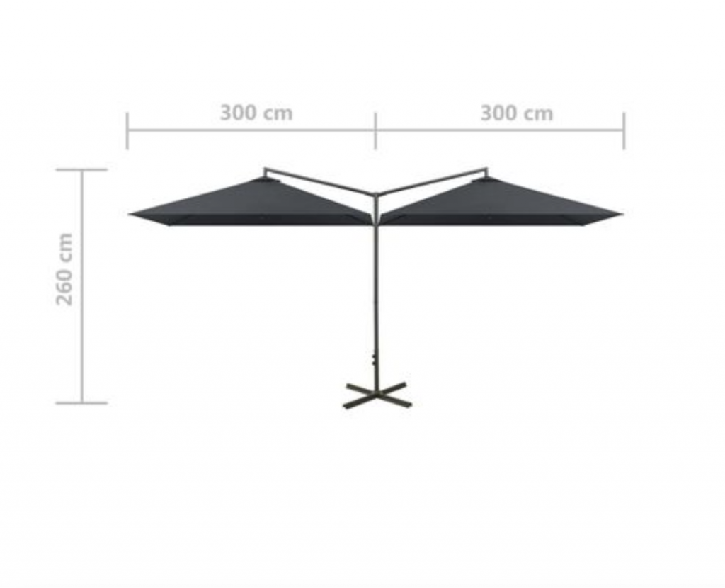 Esta sombrilla está fabricada en poliéster que proporciona una protección óptima contra las quemaduras solares. El palo robusto de acero, junto con las varillas rígidas de acero, mantiene estable a la sombrilla. Cuenta con una base cruzada de acero para agregar estabilidad. El diseño de dos cubiertas una al lado de la otra la hace práctica, elegante y única, lo que no solo proporciona un espacio más sombreado, sino que también lo hace llamativo en cualquier espacio al aire libre. Además, también se puede abrir y cerrar fácilmente gracias al mecanismo de manivela.